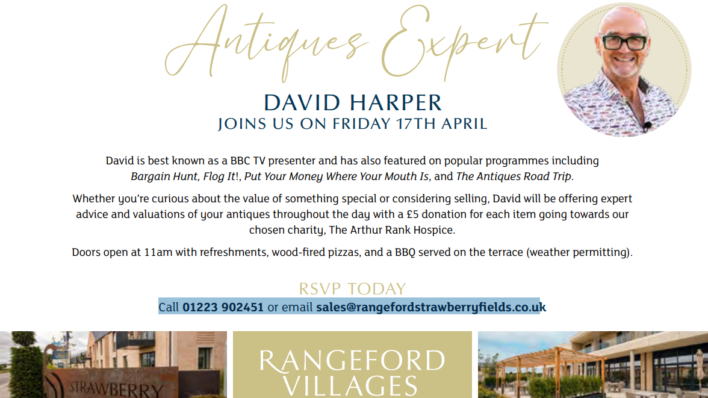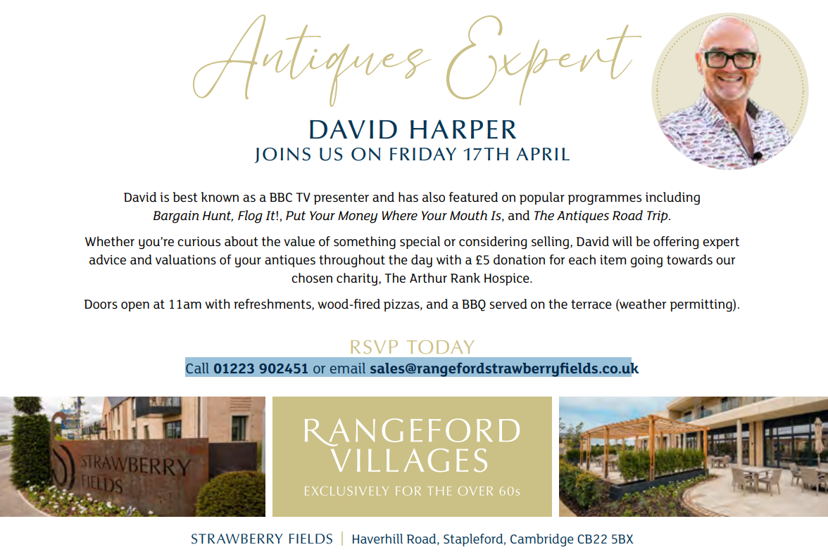 Whether you’re curious about the value of something special or considering selling, David will be offering expert advice and valuations of your antiques throughout the day with a £5 donation for each item going towards their chosen Charity, Arthur Rank Hospice.